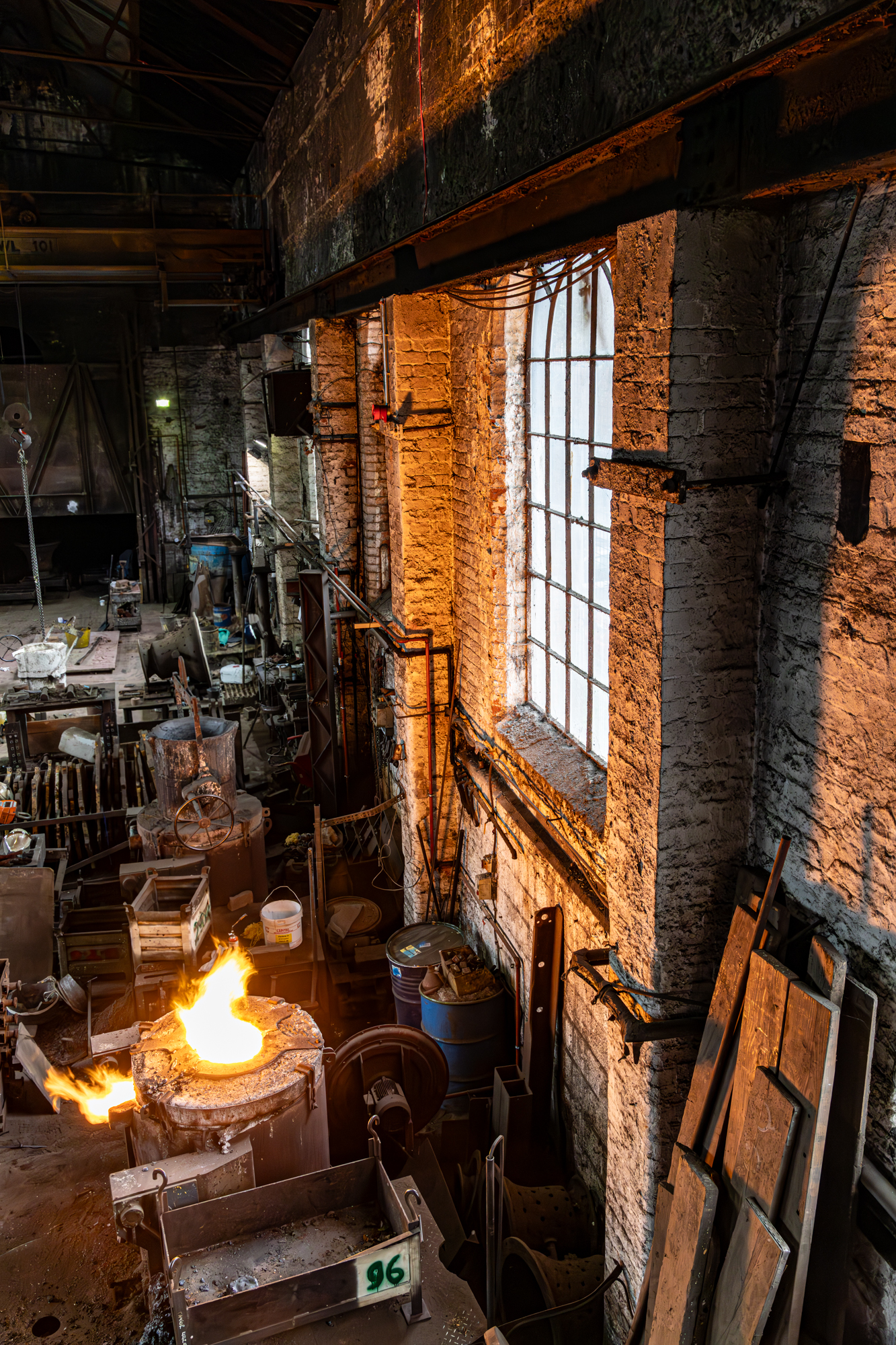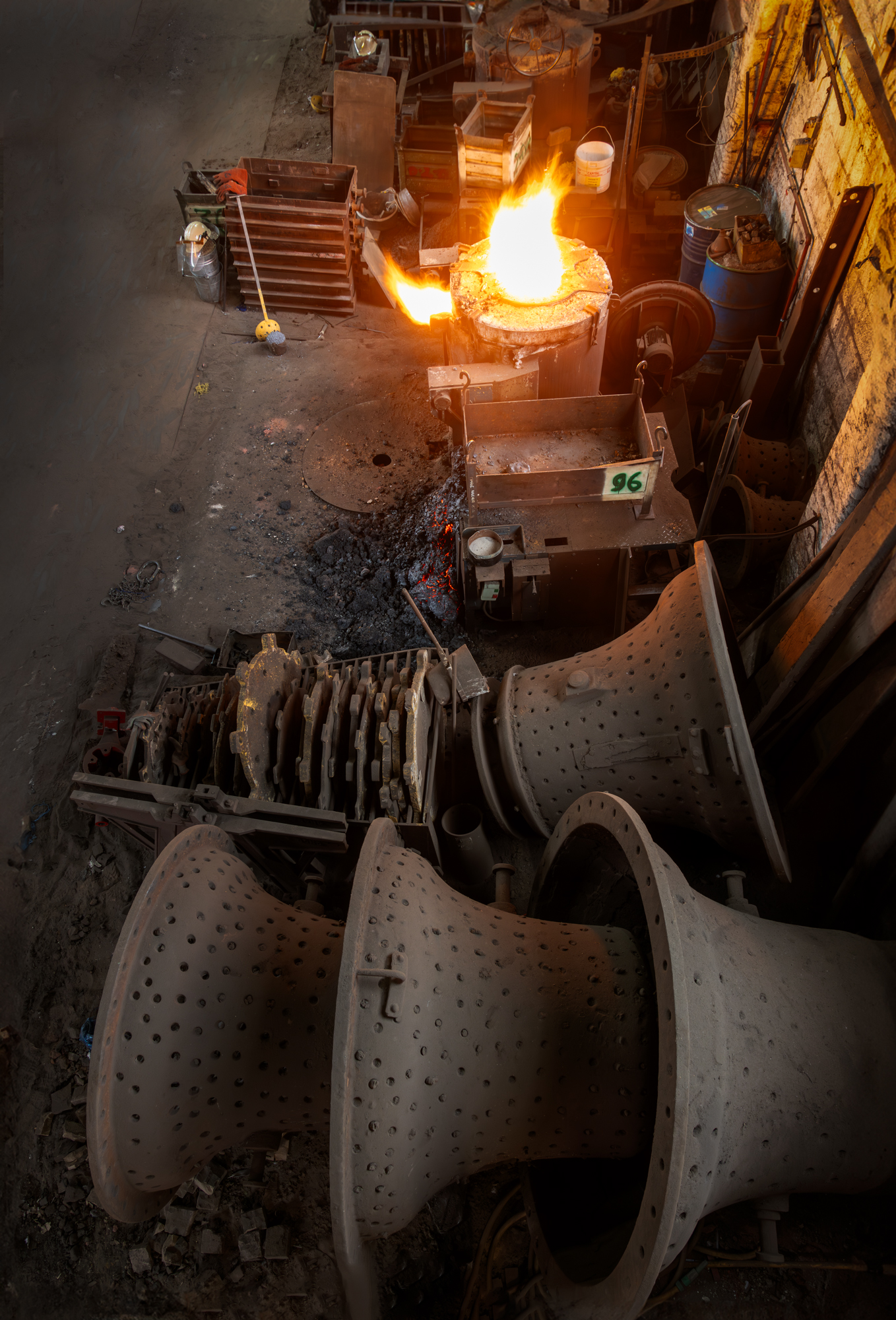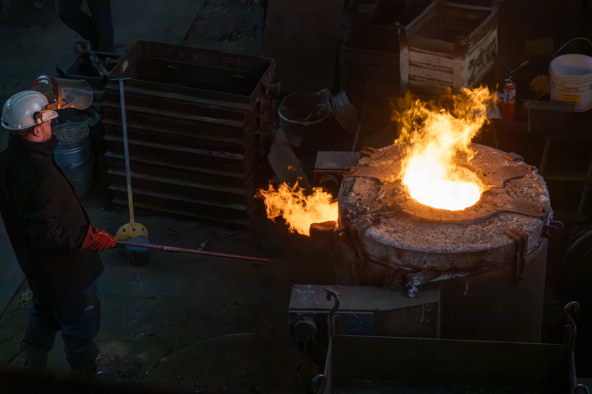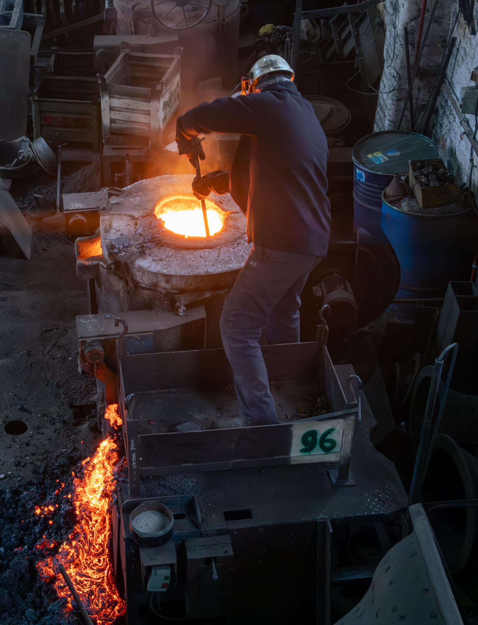 When the moulds are complete they are ready for the casting process. I was lucky enough to be there on a day when the casting was happening. The initial stages are to get the molten metal to temperature and remove any slag.